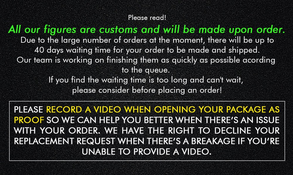 In case the figure breaks when you receive it, don't worry and give it a bad review immediately, just send me message and a picture of the broken figure and I will send you a new figure for free.